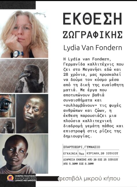 Lydia van Fondern, a German artist who has been living on Meganisi for the past 28 years, invites us to see the world through her sensitive lens. With works that convey deep emotions and “capture” the souls of both people and animals, the exhibition showcases a rich artistic journey full of passion and a return to the roots of creation. Location: Spartochori, Gymnasium