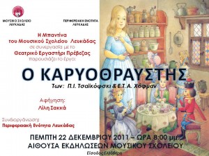 Την Πέμπτη 22 Δεκεμβρίου στις 8:00 μμ. το βράδυ, η Μπαντίνα του Μουσιού Σχολείου Λευκάδας θα παρουσιάσει το έργο «Ο καρυοθραύστης» του Π.Ι. Τσαϊκόφσκι, με παράλληλη αφήγηση του ομώνυμου παραμυθιού του Ε.Τ.Α. Χόφμαν από την ηθοποιό Λίλη Σακκά (Θεατρικό Εργαστήρι Πρέβεζας). Είσοδος Ελεύθερη.