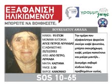 Εξαφανίστηκε στις 22/12/2011 από Άγιο Πέτρο Λευκάδας, είναι 95 ετών και διατρέχει σοβαρό κίνδυνο λόγω προβλημάτων υγείας.