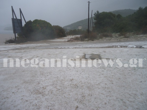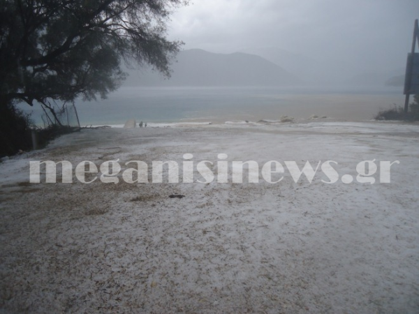 Τα «δόντια» έδειξε για μια ακόμη φορά ο καιρός στο Μεγανήσι, όπου το χαλάζι που έπεφτε για περίπου ένα τέταρτο της ώρας, ήταν αρκετό ώστε ν’ “ασπρίσει” όλο το νησί.