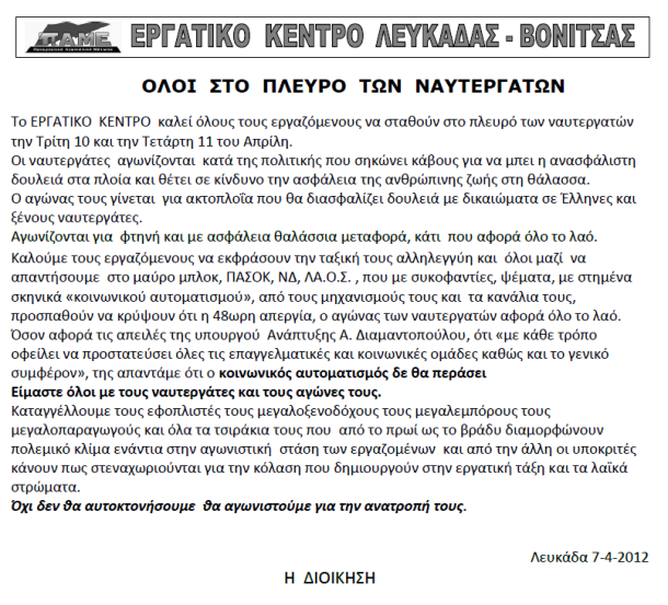 Έτσι για να κάνω και το δικηγόρο του Διαβόλου Σύντροφοι μπορείτε να μου απαντήσετε σε μια απλοϊκή ερώτηση.Πόσοι Ναυτεργάτες υπάρχουν στην Ελληνική Ναυτιλία ;και από αυτούς πόσοι κάνουν απεργία. Δηλαδή οι συνάδελφοι στα Ποντοπόρα πλοία ,στα Γκαζάδικα στα “Κοντεινάρικα” κ.τ.λ κάνουν απεργία η μήπως κάνουν μόνο οι Δημόσιοι Υπάλληλοι της Ναυτιλίας , μόνο δηλαδή οι ναυτικοί της Ακτοπλοΐας;Μη με παρεξηγήσατε .. απλώς θέλω να ξέρω πως έχουν τα πράγματα για να ξέρω τελικά αν πρέπει να είμαι (όχι εγώ προσωπικά αλλά ο κάθε πολίτης) μαζί σας;