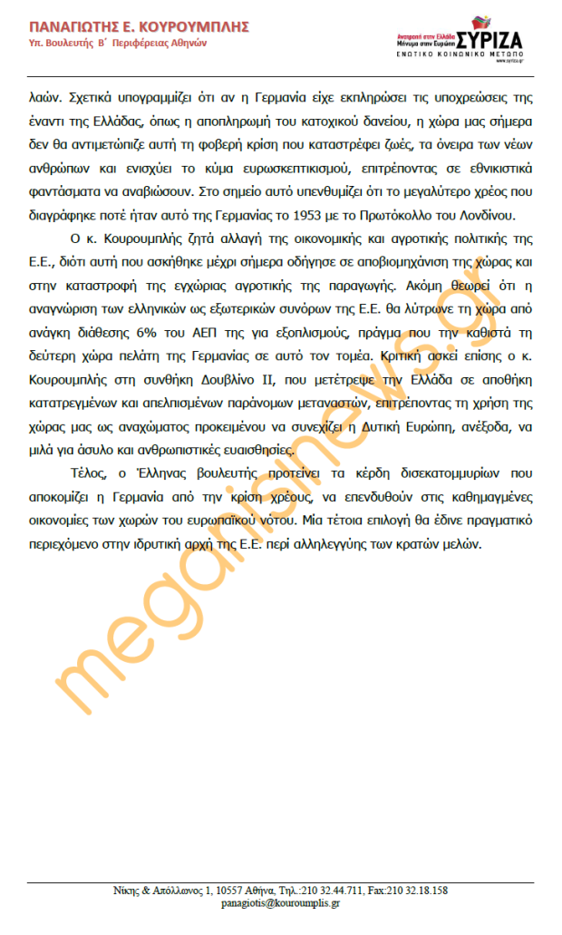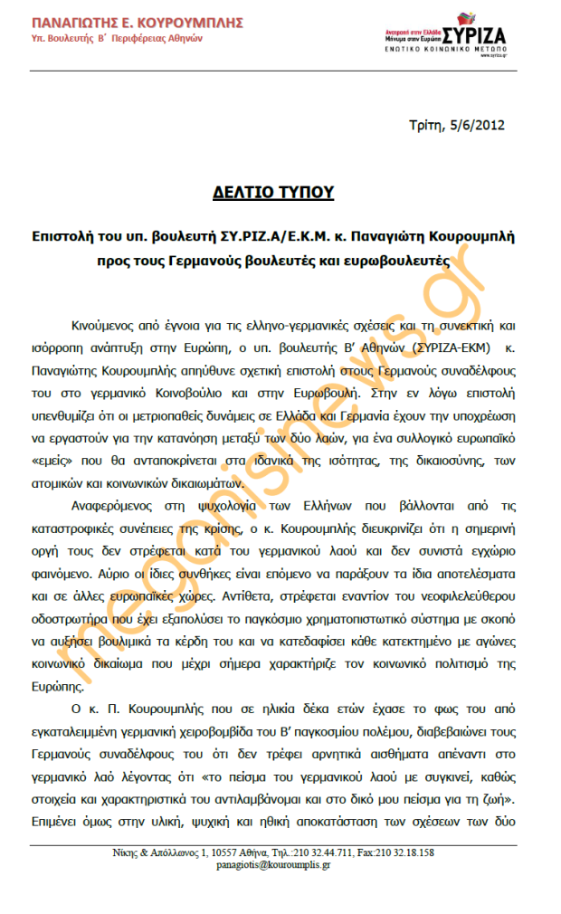 ΑΝΑΚΟΙΝΩΣΕΙΣ - ΔΕΛΤΙΑ ΤΥΠΟΥ 5 Ιουνίου 2012 0 Επιστολή του κ. Παν. Κουρουμπλή προς τους Γερμανούς βουλευτές και ευρωβουλευτές Διαβάστε την επιστολή εδώ. Σύντομος σύνδεσμος άρθρου: https://meganisinews.eu/post/wsva ShareTweet0 Shares Tags: ΓΕΡΜΑΝΙΚΟ ΚΟΙΝΟΒΟΥΛΙΟ, ΕΠΙΣΤΟΛΗ, ΕΥΡΩΚΟΙΝΟΒΟΥΛΙΟ, ΠΑΝΑΓΙΩΤΗΣ ΚΟΥΡΟΥΜΠΛΗΣ, ΣΥΡΙΖΑ - ΕΚΜ