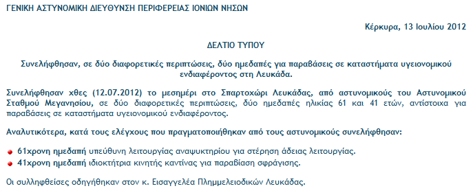 Συνελήφθησαν χθες (12.07.2012) το μεσημέρι στο Σπαρτοχώρι Λευκάδας, από αστυνομικούς του Αστυνομικού Σταθμού Μεγανησίου, σε δύο διαφορετικές περιπτώσεις, δύο ημεδαπές ηλικίας 61 και 41 ετών, αντίστοιχα για παραβάσεις σε καταστήματα υγειονομικού ενδιαφέροντος.