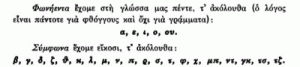 Φωνήεντα έχομε στη γλώσσα μας πέντε, τ’ ακόλουθα (ο λόγος είναι πάντοτε για φθόγγους και όχι για γράμματα): α, ε, ι, ο, ου.