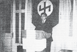 Φωτογραφίες από το πρώτο Συνέδριο της Χρυσής Αυγής τον Φεβρουάριο του 1990 με τον αγκυλωτό σταυρό να βρίσκεται σε περίοπτη θέση, ενώ ο επικεφαλής της ναζιστικής οργάνωσης Νίκος Μιχαλολιάκος μιλά με φόντο την ελληνική σημαία και το σύμβολο παραστρατιωτικών γερμανικών-ναζιστικών οργανώσεων.