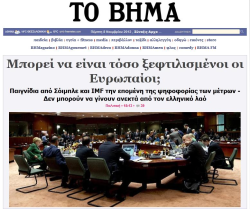 Αυτή την στιγμή, κεντρικό άρθρο του Vima.gr τιτλοφορείται «Μπορεί να είναι τόσο ξεφτιλισμένοι οι Ευρωπαίοι; «. Συγγραφέας του πονήματος είναι ο Καρακούσης, αυτή η ναυαρχίδα της διεισδυτικής και ανεξάρτητης δημοσιογραφίας που μόνο ο ΔΟΛ ξέρει να εξασκεί. Ο Καρακούσης μέσω του άρθρου του σήμερα απορεί με το πόσο ξεφτιλισμένοι είναι «οι Ευρωπαίοι» (για να πιάσει και λίγο το αντι-Μέρκελ κλίμα), γιατί σου λέει, αφού ανέλαβε ο Σαμαράς το δυσβάσταχτο ιστορικό βάρος της υπερψήφισης, αφού τα πήραμε τα μέτρα, γιατί δεν μας δίνουν τα λεφτά; Στην «αγωνιστική» κατακλείδα παράγραφο μάλιστα προτείνει στον «εθνάρχη» άμα λάχει να μας βγάλει έξω από την Ευρωζώνη, για λόγους εθνικής αξιοπρέπειας.