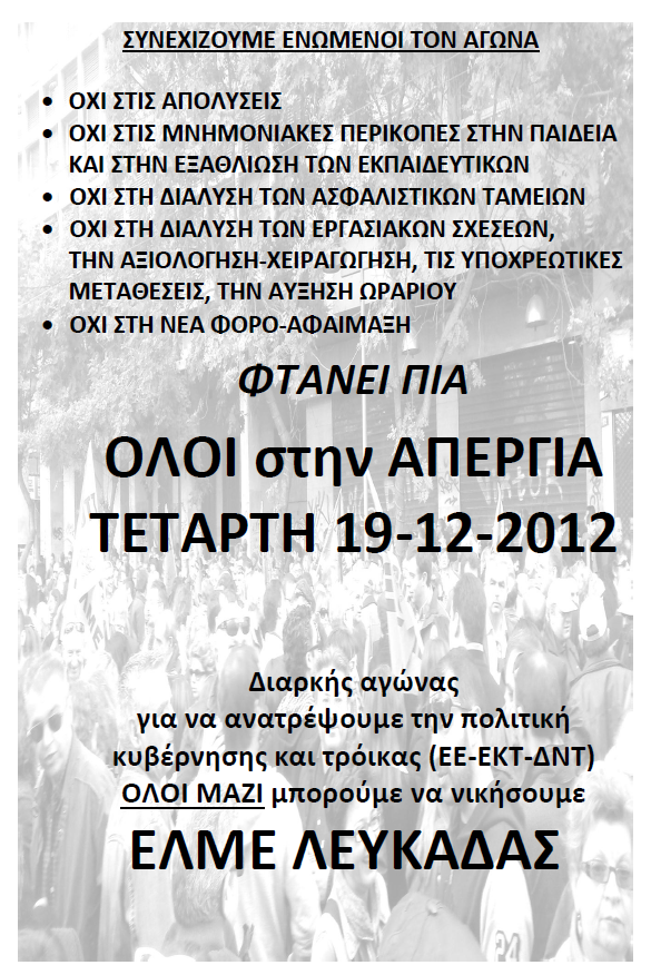 ΑΝΑΚΟΙΝΩΣΕΙΣ - ΔΕΛΤΙΑ ΤΥΠΟΥ 17 Δεκεμβρίου 2012 0 Ενημέρωση από την ΕΛΜΕ Λευκάδας: Όλοι στην απεργία της 19-12-2012 Σύντομος σύνδεσμος άρθρου: https://meganisinews.eu/post/dxun ShareTweet0 Shares Tags: ΑΠΕΡΓΙΑ 19-12-2012, ΕΛΜΕ ΛΕΥΚΑΔΑΣ