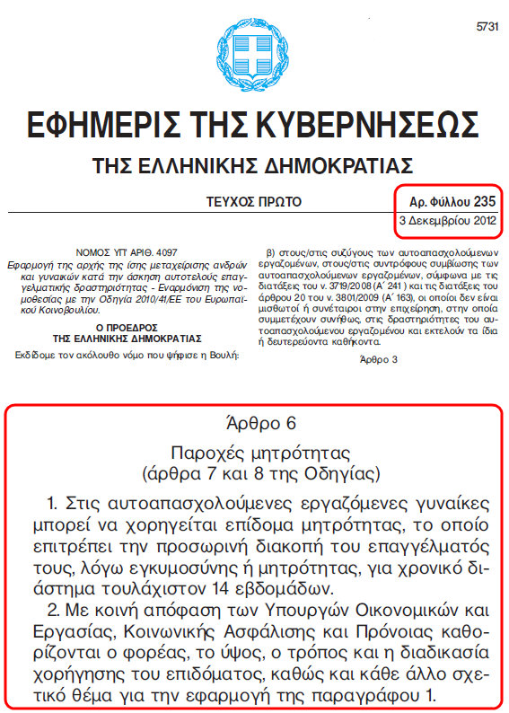 Επίδομα μητρότητας θα παίρνουν οι αυτοαπασχολούμενες εργαζόμενες γυναίκες σύμφωνα με τον Ν.4097/2012 (ΦΕΚ Α’ 235/03-12-2012) για την «Εφαρμογή της αρχής της ίσης μεταχείρισης ανδρών και γυναικών κατά την άσκηση αυτοτελούς επαγγελματικής δραστηριότητας».