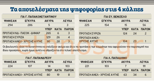 Με 265 ψήφους υπέρ, 6 κατά και 3 «παρών» παραπέμπεται σε Προανακριτική Επιτροπή ο πρώην υπ. Οικονομικών Γ. Παπακωνσταντίνου, ενώ δεν παραπέμφθηκαν οι Ευ. Βενιζέλος, Γ. Παπανδρέου και Λ. Παπαδήμος, οι οποίοι συγκέντρωσαν 124, 80 και 63 θετικές ψήφους αντίστοιχα. 119 είναι το σύνολο των βουλευτών της αντιπολίτευσης και 163 της συμπολίτευσης.