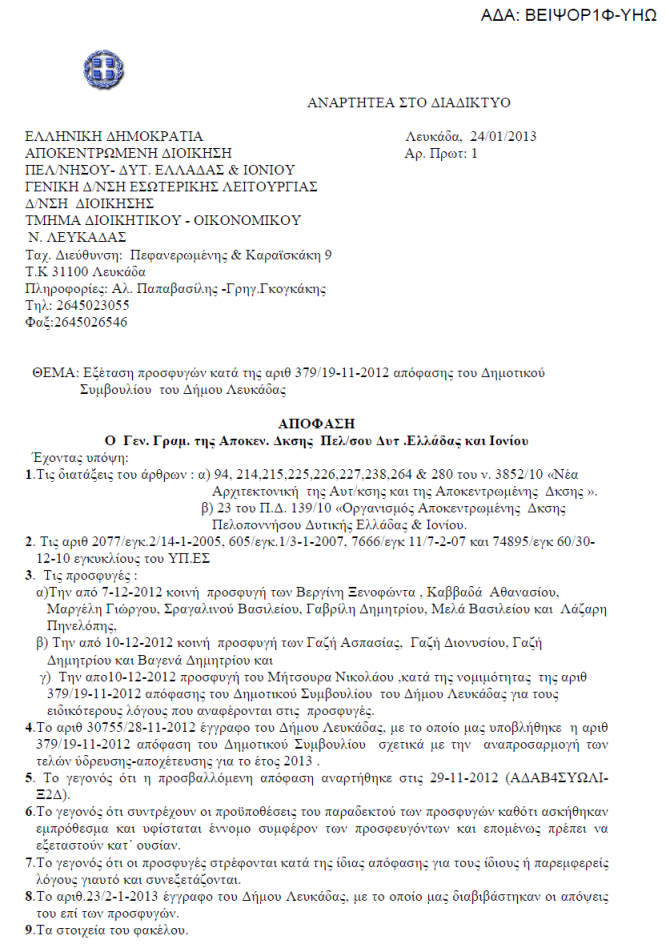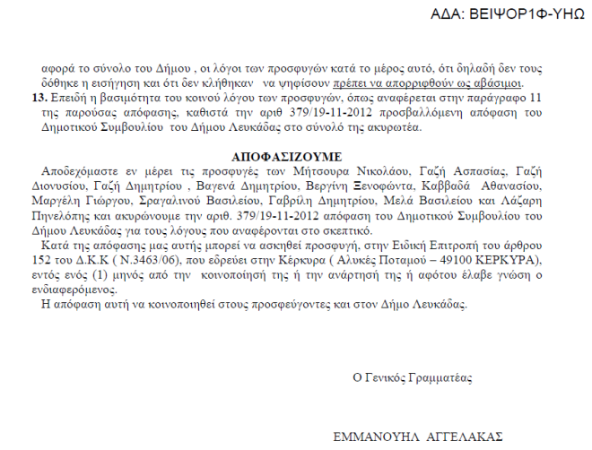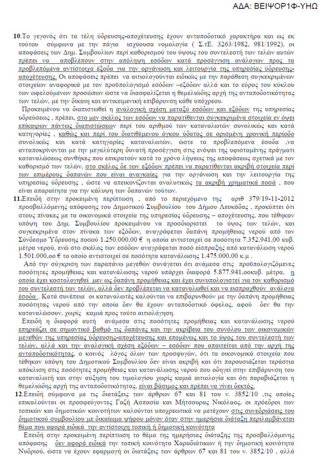 Η Αποκεντρωμένη Διοίκηση Πελοποννήσου Δυτικής Ελλάδας και Ιονίων Νήσων ακύρωσε την απόφαση 379/19-11-2012 του Δ.Σ. του Δήμου Λευκάδας που αφορά την αύξηση των τελών ύδρευσης-αποχέτευσης έπειτα από την προσφυγή της παράταξής μας.
