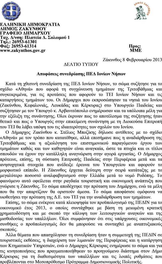 Επίσης συμμετείχαν στην συνεδρίαση της ΠΕΔ Ιονίων Νήσων . Ανάμεσα στα θέματα που τους απασχόλησαν ήταν και το θέμα της κατάργησης του ΤΕΙ Ιονίων Νήσων.