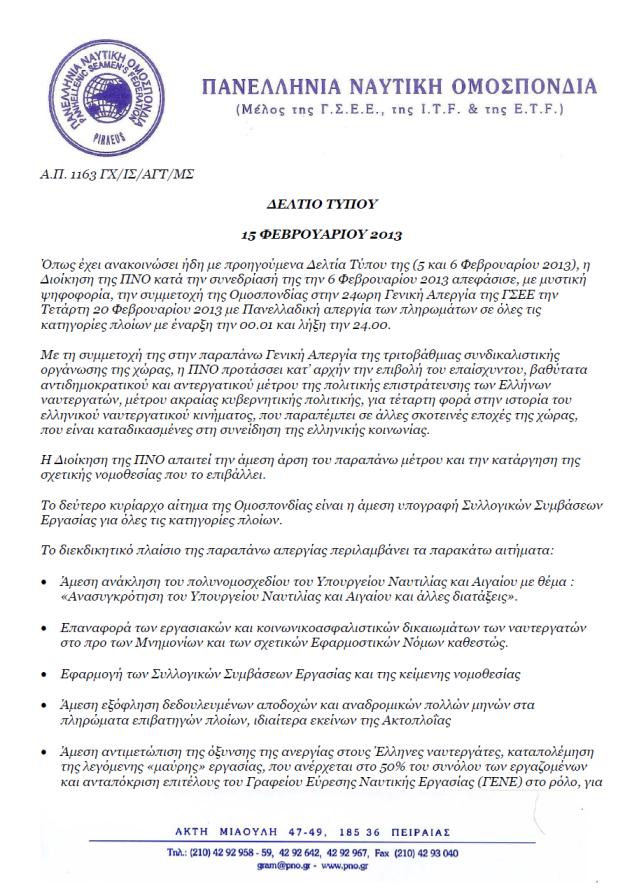 ΑΝΑΚΟΙΝΩΣΕΙΣ - ΔΕΛΤΙΑ ΤΥΠΟΥ 16 Φεβρουαρίου 2013 0 Δελτίο τύπου – κάλεσμα της ΠΝΟ για συμμετοχή στην απεργία και τις κινητοποιήσεις στις 20 Φεβρουαρίου Σύντομος σύνδεσμος άρθρου: https://meganisinews.eu/post/wquu ShareTweet0 Shares Tags: 20 ΦΕΒΡΟΥΑΡΙΟΥ, ΑΠΕΡΓΙΑ, ΠΝΟ