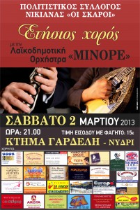 Σας προσκαλούμε στον ετήσιο χορό που διοργανώνουμε στο «Κτήμα Γαρδέλη», το Σαββάτο 2 Μαρτίου 2013 και ώρα 21:00. Στη συντροφιά μας θα είναι η λαϊκοδημοτική ορχήστρα «Μινόρε» και η είσοδος είναι15€ με φαγητό.