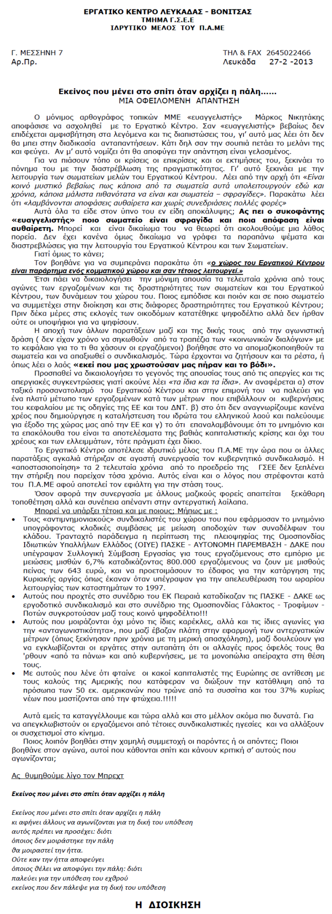 Παρότι γνωρίζω ότι μερικοί ψάχνουν τα λεγόμενά μου για να βγάλουν είδηση, εντούτοις κι αυτή την φορά θα τους διαψεύσω πανηγυρικώς. Δυστυχώς, δεν θα πάρω θέση ούτε υπερ Νικητάκη (μόλις σήμερα διάβασα το άρθρο του), ούτε υπΈρ Εργατικού Κέντρου. Θα μπορούσε να επιχειρηματολογήσει κανείς άνετα και υπέρ της μίας και υπέρ της άλλης πλευράς χωρίς η επιχειρηματολογία να στερείται τεκμηρίωσης. Η πραγματικότητα είναι όμως αυτή που γίναμε μάρτυρες όλοι την Τετάρτη 20 Φεβροαρίου στην Πανελλαδική απεργία, όπου ήταν ανύπαρκτη η ΕΛΜΕ παρόλες τις περικοπές και τις αυξήσεις ωραρίων και τις διαθεσιμότητες, και τα μαγαζιά στο παζάρι προτίμησαν να παραμείνουν ανοιχτά ανεξάρτητα από το ότι είχαν από έναν ή και κανέναν πελάτη.