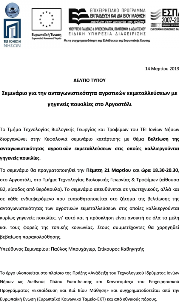 Σεμινάριο με θέμα Βελτίωση της ανταγωνιστικότητας αγροτικών εκμεταλλεύσεων στις οποίες καλλιεργούνται γηγενείς ποικιλίες, που θα γίνει στο Τμήμα Τεχνολογίας Βιολογικής Γεωργίας & Τροφίμων στο Αργοστόλι.