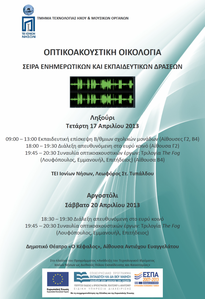 Το Τμήμα Τεχνολογίας Ήχου και Μουσικών Οργάνων του ΤΕΙ Ιονίων Νήσων και συγκεκριμένα ο Τομέας Εφαρμοσμένης Τεχνολογίας διοργανώνει σειρά δράσεων, στο πλαίσιο του έργου Οπτικοακουστική Οικολογία: Αποτύπωση του φυσικού περιβάλλοντος του Ιονίου Πελάγους σε μορφή Ψηφιακού Μουσείου Περιβαλλοντικής Εκπαίδευσης.