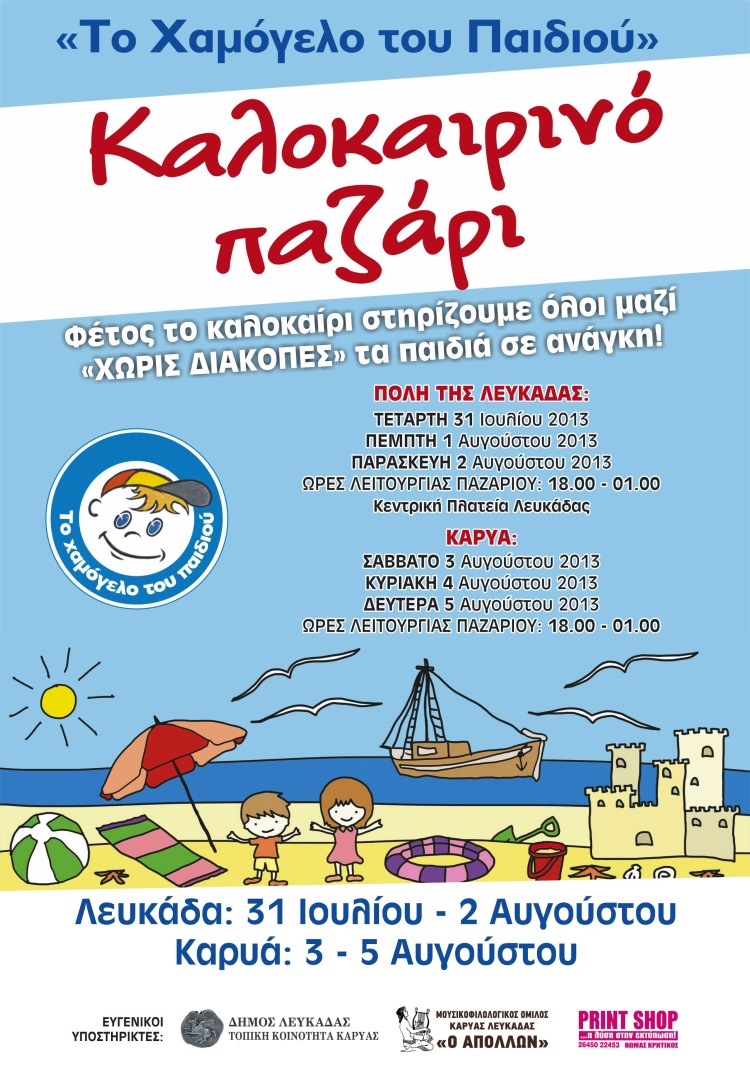«Το Χαμόγελο του Παιδιού» θα βρεθεί στην Λευκάδα, προκειμένου να πραγματοποιήσει καλοκαιρινό παζάρι, από την Τετάρτη 31 Ιουλίου 2013 και θα παραμείνει έως την Δευτέρα 5 Αυγούστου 2013, με σκοπό την ενημέρωση και ευαισθητοποίηση του κοινού για το πολύπλευρο έργο του, που στόχο έχει τη φροντίδα και προστασία χιλιάδων παιδιών στην Ελλάδα.