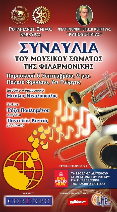 Την Παρασκευή 6 Σεπτεμβρίου 2013 στο χώρο του Παλαιού φρουρίου και ώρα 9:00 μ.μ. ο Ροταριανός Ομιλος Κέρκυρας με την φιλαρμονική ένωση Κερκύρας Καποδίστριας διοργανώνει συναυλία με την συμετοχή της σοπράνο Ρόζα Πουλημένου και του βαρύτονου Παντελή Κοντού.