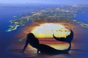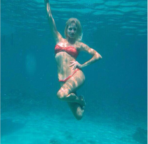 Eντυπωσιακό το κοντράστ του κόκκινου μαγιό με το μοναδικό χρώμα της θάλασσας στη Λευκάδα. Η Ευαγγελία Αραβανή ποζάρει ως γοργόνα στο Μεγανήσι.