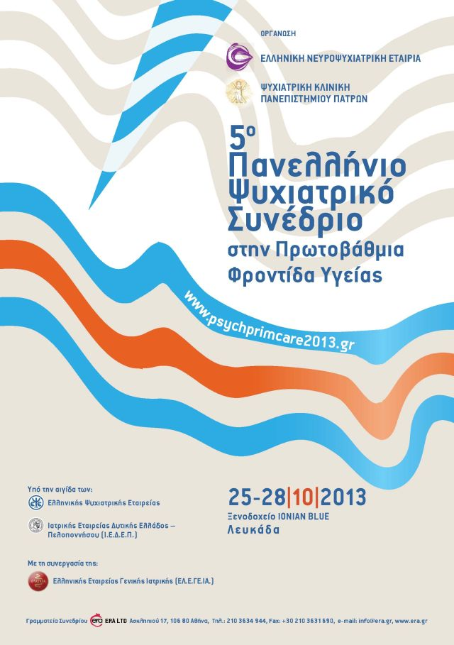 Το 5ο Πανελληνίο Ψυχιατρικό Συνέδριο, στην Πρωτοβάθμια Φροντίδα Υγείας, οργανώνεται από την Ελληνική Νευροψυχιατρική Εταιρία και την Ψυχιατρική Κλινική του Πανεπιστημίου Πατρών και θα πραγματοποιηθεί στην Λευκάδα, στις 25- 28 Οκτωβρίου 2013.