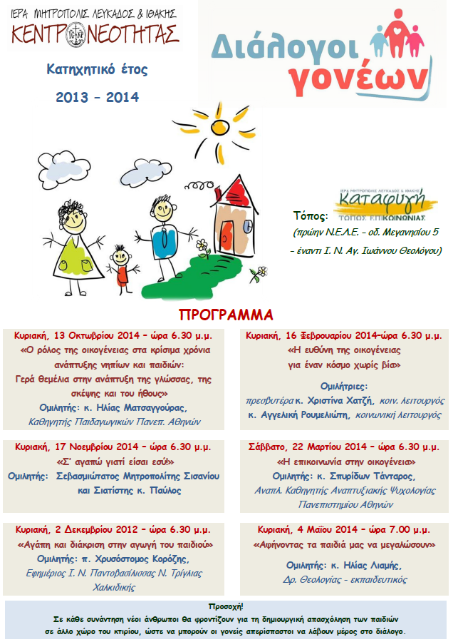 Έτσι, την Κυριακή, 13 Οκτωβρίου 2013 και ώρα 6.30 μ.μ. στην «Καταφυγή» (παλαιά Μητρόπολη – πρώην Ν.Ε.Λ.Ε. – οδ. Μεγανησίου 5, έναντι Ι. Ναού Αγ. Ιωάννου Θεολόγου, πλησίον Κεντρικής Πλατείας) θα πραγματοποιηθεί η πρώτη, για φέτος, συνάντηση των «Διαλόγων Γονέων», με ομιλητή τον κ. Ηλία Ματσαγγούρα, Καθηγητή Παιδαγωγικών Πανεπ. Αθηνών και θέμα: «Ο ρόλος της οικογένειας στα κρίσιμα χρόνια ανάπτυξης νηπίων και παιδιών: Γερά θεμέλια στην ανάπτυξη της γλώσσας, της σκέψης και του ήθους». Θα ακολουθήσει ελεύθερη συζήτηση.