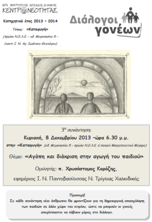 Και με τον τρόπο αυτό, το χέρι του Χριστού απλώνεται και στους γονείς σε μια πρόσκληση, περιμένοντας την ανταπόκριση! Η αγκαλιά της Εκκλησίας μας, παραμένει ανοιχτή και μας χωράει όλους! Την Κυριακή 8 Δεκεμβρίου 2013 και ώρα 18.30 στην «Καταφυγή» (παλαιά Μητρόπολη – πρώην Ν.Ε.Λ.Ε. – οδ. Μεγανησίου 5, έναντι Ι. Ναού Αγ. Ιωάννου Θεολόγου, πλησίον Κεντρικής Πλατείας) θα πραγματοποιηθεί η τρίτη για φέτος, συνάντηση των «Διαλόγων Γονέων», με ομιλητή τον π. Χρυσόστομο Κορόζη, εφημέριο του Ι. Ν. Παντοβασίλισσας Ν. Τρίγλιας Χαλκιδικής με θέμα: