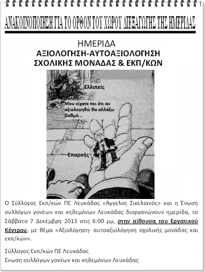 Ο Σύλλογος Εκπαιδευτικών ΠΕ Λευκάδας «Άγγελος Σικελιανός» και η Ένωση Συλλόγων Γονέων και Κηδεμόνων Λευκάδας διοργανώνουν Ημερίδα, το Σάββατο 7 Δεκέμβρη 2013 στις 6.00 μ.μ., στην αίθουσα στην αίθουσα του Εργατικού Κέντρου, με θέμα «Αξιολόγηση – αυτοαξιολόγηση σχολικής μονάδας και εκπ/κών».