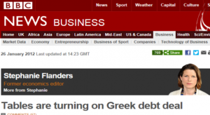Μεταβολή στην ισορροπία δυνάμεων γύρω από το διαπραγματευτικό τραπέζι για το Ελληνικό χρέος διαπιστώνει η οικονομική συντάκτης του BBC, Στέφανι Φλάντερς σε ανάλυσή της για την ιστοσελίδα του Βρετανικού δικτύου.Στην ανάλυσή της συντάκτριας του BBC τονίζεται ότι η χώρα πλήρωσε το 2011 περισσότερο τόκο κατά 23% περισσότερο σε σχέση με το 2010, παρά τα «φθηνά» δάνεια από τους Ευρωπαίους και το ΔΝΤ (σ.σ. ειρωνικά τα εισαγωγικά της συντάκτριας).