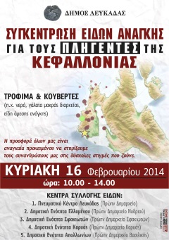 Ο Δήμος Λευκάδας στο πλαίσιο παροχής βοήθειας προς τους πληγέντες από το σεισμό στη Κεφαλλονιά θα συγκεντρώσει και θα αποστείλει τρόφιμα (π.χ.νερό, γάλατα μακράς διαρκείας, είδη άμεσης ανάγκης ) και κουβέρτες.