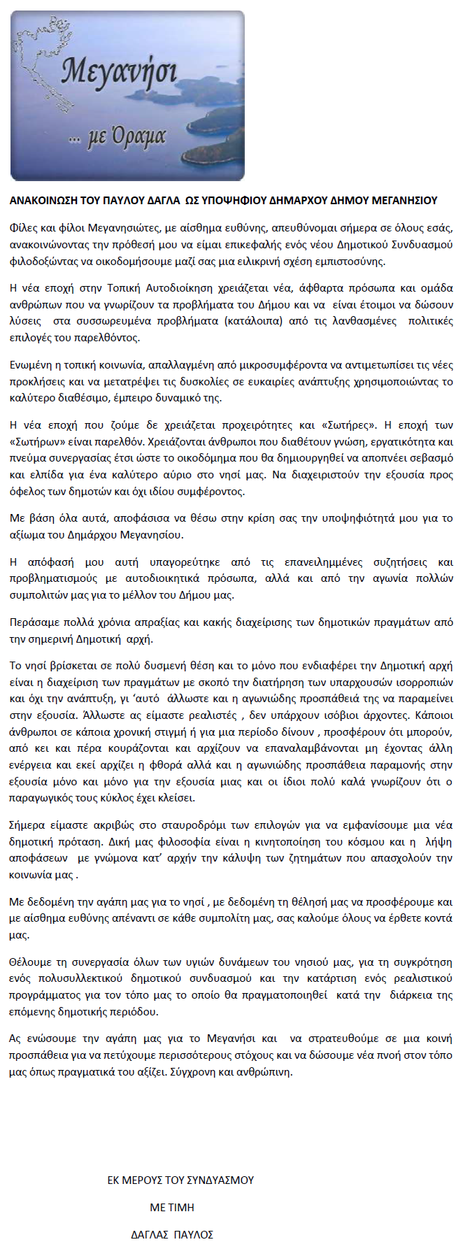 ΑΝΑΚΟΙΝΩΣΗ ΤΟΥ ΠΑΥΛΟΥ ΔΑΓΛΑ  ΩΣ ΥΠΟΨΗΦΙΟΥ ΔΗΜΑΡΧΟΥ ΔΗΜΟΥ ΜΕΓΑNΗΣΙΟΥ