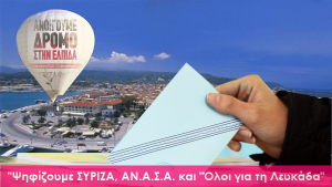 Όλα τα πιο πάνω μόνο η Αριστερά έχει την πίστη να τα υλοποιήσει. Γι΄ αυτό στις κρίσιμες αυτές εκλογές (η συμμετοχή πρέπει να είναι ΜΑΖΙΚΗ, ενεργοποιώντας τα όποια αποθέματα δύναμης μας έχουν απομείνει) ψηφίζουμε για τις ευρωεκλογές ΣΥΡΙΖΑ (χωρίς να σημαίνει ότι μόνο αυτός είναι Αριστερά) αλλά και για την Περιφέρεια Ιονίων Νήσων Α.Ν.Α.ΣΑ με επικεφαλής τον Θ. Γαλιατσάτο˙ για τον δε Δήμο Λευκάδας την δημοτική παράταξη «Όλοι για την Λευκάδα» με επικεφαλής τον Κ. Δρακονταειδή.