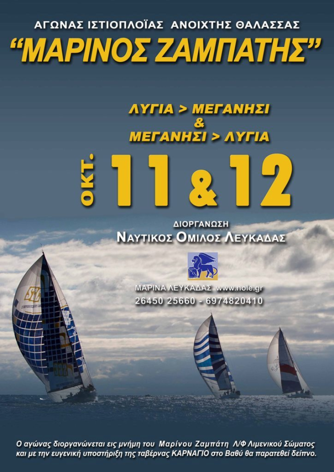 Ο Ναυτικός Όμιλος Λευκάδας διοργανώνει το Σαββάτο 11 & Κυριακή 12 Οκτωβρίου τον Αγώνα Ανοιχτής Θάλασσας «ΜΑΡΙΝΟΣ ΖΑΜΠΑΤΗΣ», εις μνήμη του Μαρίνου Ζαμπάτη Λ/Φ Λιμενικού Σώματος.