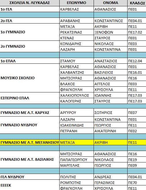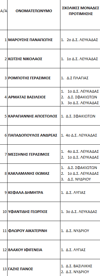 Οι υποψήφιοι (μέρος του πίνακα που έχει δημοσιοποιηθεί από την ΔΔΕ Λευκάδας στην επίσημη ιστοσελίδα της)