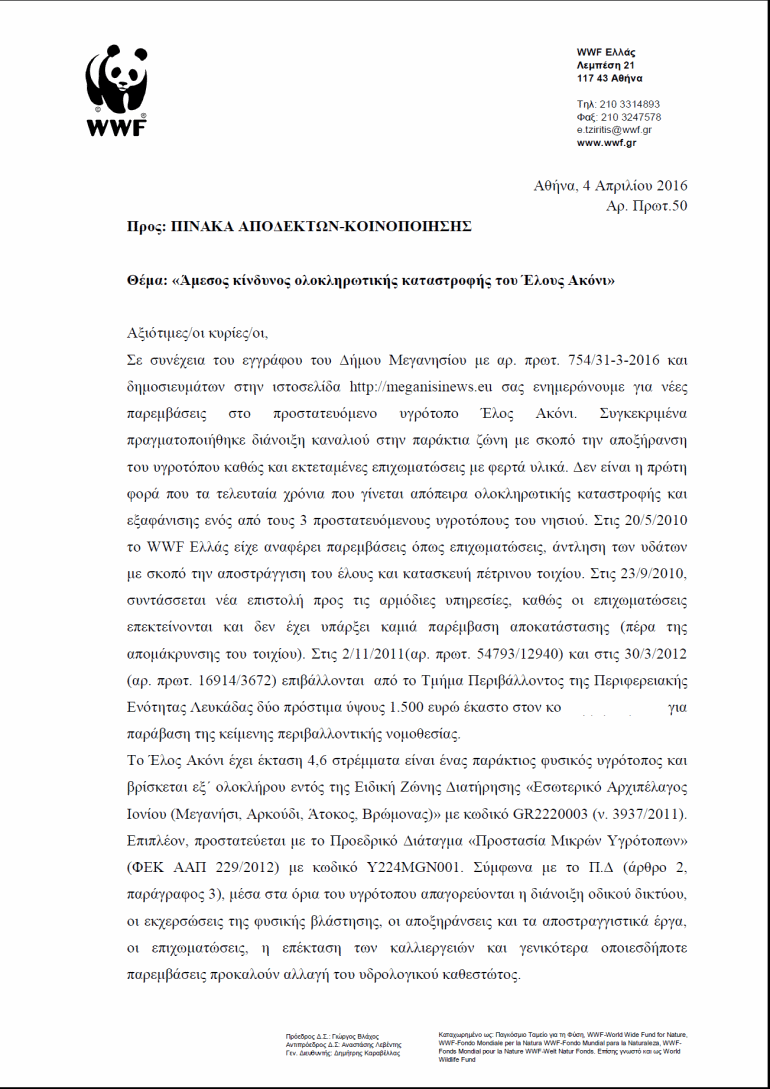 Με έγγραφο που κοινοποιεί σε 14 αποδέκτες  η WWF  υπενθυμίζει την νομική κατοχύρωση  προστασίας  της Λουτρολίμνης,  ζητά   πλήρη ενημέρωση για τις ενέργειες,  την αυστηρή  τιμωρία των ενόχων με ποινικές και διοικητικές κυρώσεις(πρόστιμα) , την  πλήρης  αποκατάσταση  του υγροβιότοπου  και την επαναφορά του  στην  αρχική του μορφή .