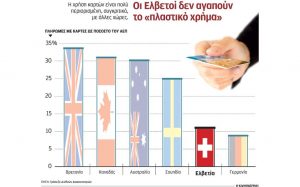 Σε μια χώρα, όπως η Ελβετία, που επιτρέπει ανώνυμες συναλλαγές με μετρητά έως και 100.000 ελβετικών φράγκων, δηλαδή σχεδόν 92.000 ευρώ και μερικά καταστήματα διαλαλούν ότι δεν δέχονται κάρτες, εντύπωση προκαλεί το ότι η χρήση πλαστικού χρήματος στη χώρα των τραπεζών είναι μεν χαμηλή, αλλά υπερβαίνει εκείνη της Γερμανίας.