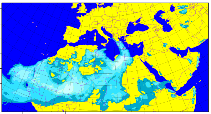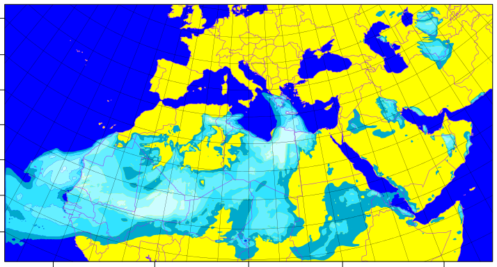 Παρακάτω τρεις σημερινές εικόνες από το meteoclima.hua.gr που δείχνουν με γαλάζιο χρώμα την κατάσταση στις 8:00 πμ, 14:00 μμ και 17:οο μμ.