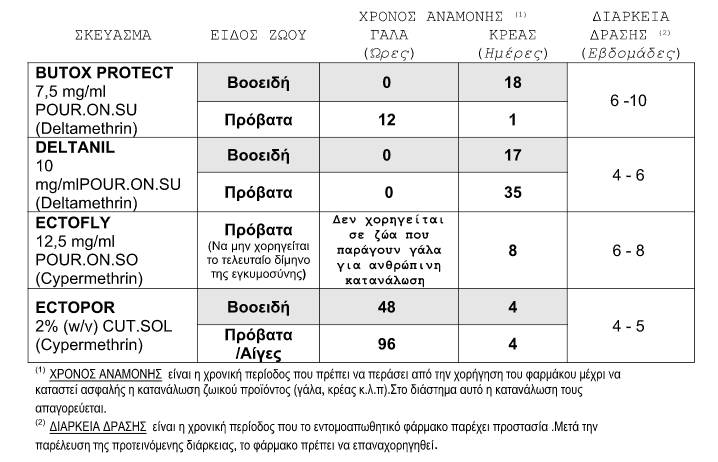 Για την διευκόλυνση των κτηνοτρόφων παραθέτουμε πίνακα, με βάση σχετική εγκύκλιο του Υπουργείου Αγροτικής Ανάπτυξης και Τροφίμων, εγκεκριμένων εντομοαπωθητικών για χρήση επί των ζώων: