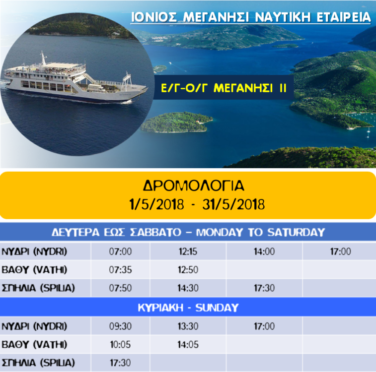 Δείτε τα δρομολόγια που έχουν συνταχθεί από την “ΙΟΝΙΟΣ ΜΕΓΑΝΗΣΙ ΝΑΥΤΙΚΗ ΕΤΑΙΡΕΙΑ” για την περίοδο 1/5/018-31/5/2018.