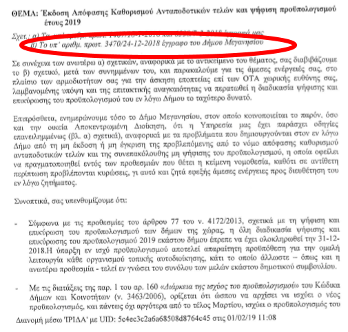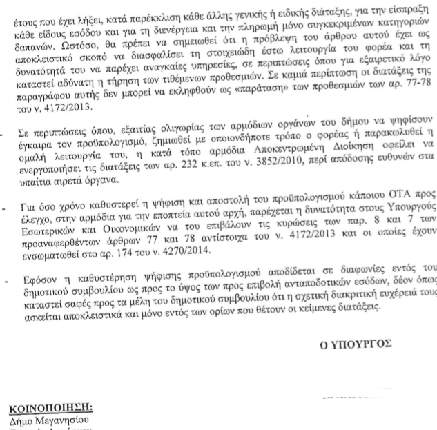 Σύμφωνα με το έγγραφο που δημοσιεύουμε το Υπουργείο καλεί την Αποκεντρωμένη να προβεί στην επιβολή κυρώσεων σε περίπτωση που διαπιστωθεί οικονομική βλάβη στον δήμο εξαιτίας της μη έγκαιρης ψήφισης του προϋπολογισμού του δήμου Μεγανησίου.