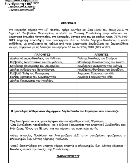 Απόσπασμα απ΄το πρακτικό της 6ης συνεδρίασης του Δημοτικού Συμβουλίου δήμου Μεγανησίου