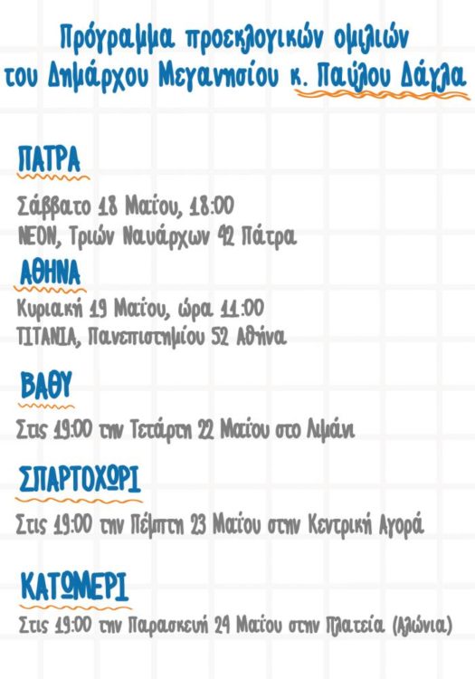 ΜΕΓΑΝΗΣΙΩΤΙΚΑ 7 Μαΐου 2019 0 Πρόγραμμα ομιλιών της παράταξης “Μεγανήσι με …όραμα” Σύντομος σύνδεσμος άρθρου: https://meganisinews.eu/post/n9ry ShareTweet0 Shares
